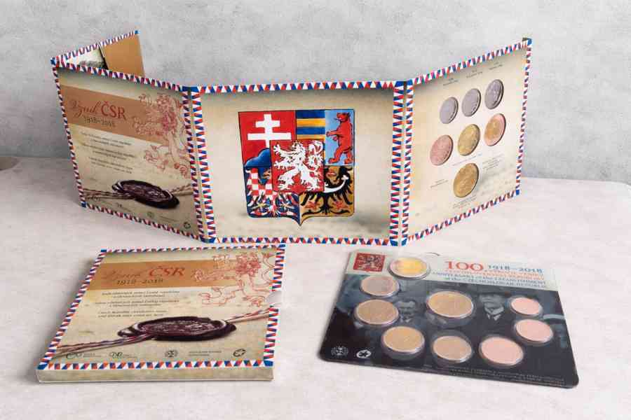 Sada oběžných mincí České republiky a slovenských euromincí roku 2018 ke vzniku ČSR.