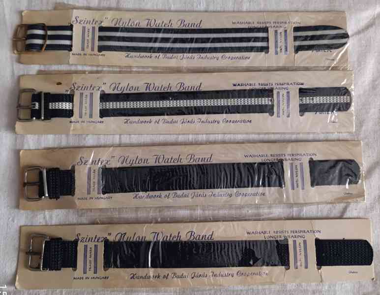 Prodám 4 kusy absolutně nových, nerozbalených retro nylonových pásků na náramkové hodinky, vyrobeno v Maďarsku, průmyslové družstvo Budai Jarase, ruční výroba v šedesátých letech. Cena za kus 90,- Kč, možno i jednotlivě. Osobní předání na Praze 3, nebo odeslání přes Zásilkovnu či Balíkovnu. Volejte 770 630 523, nebo pište na morgiana007@gmail.com